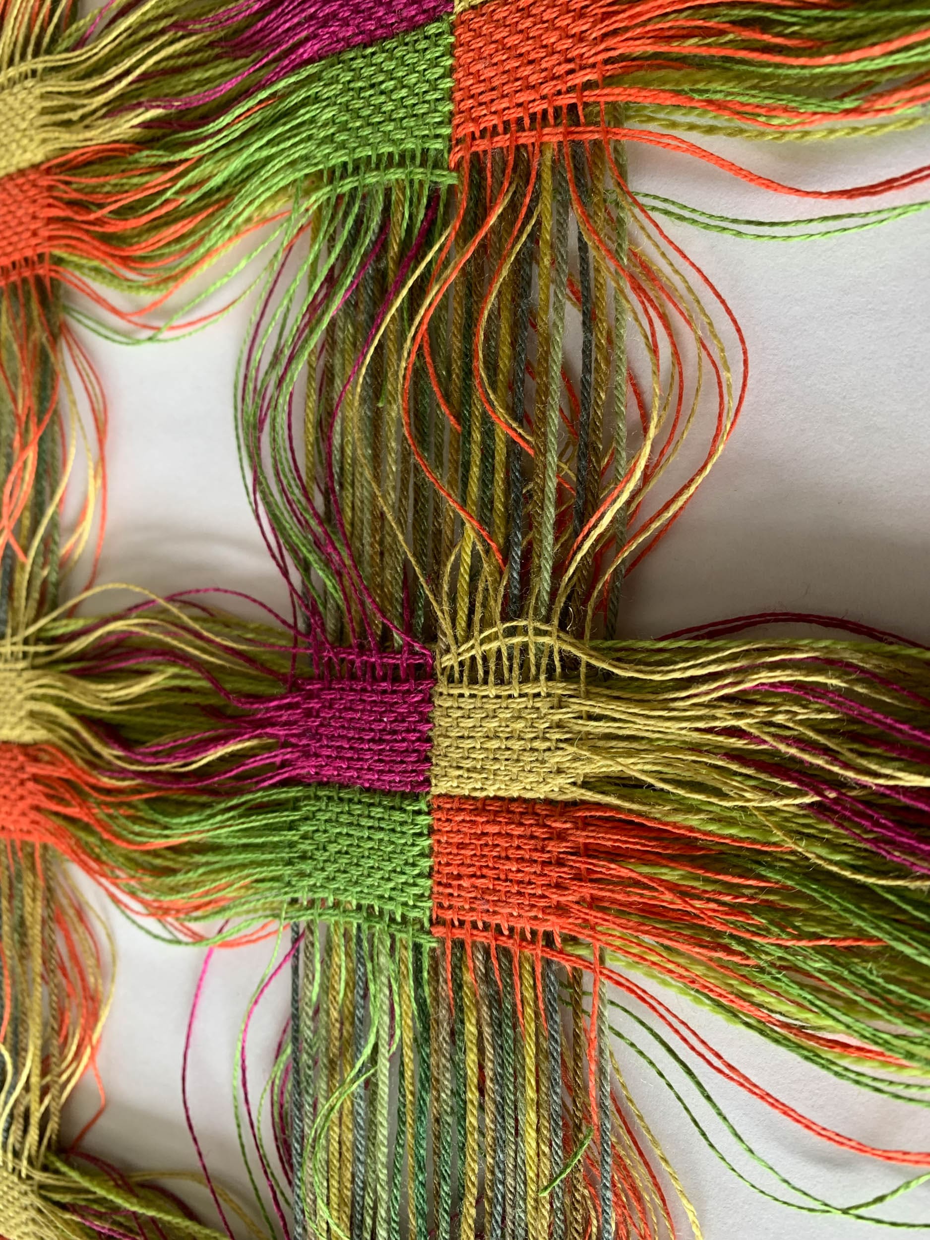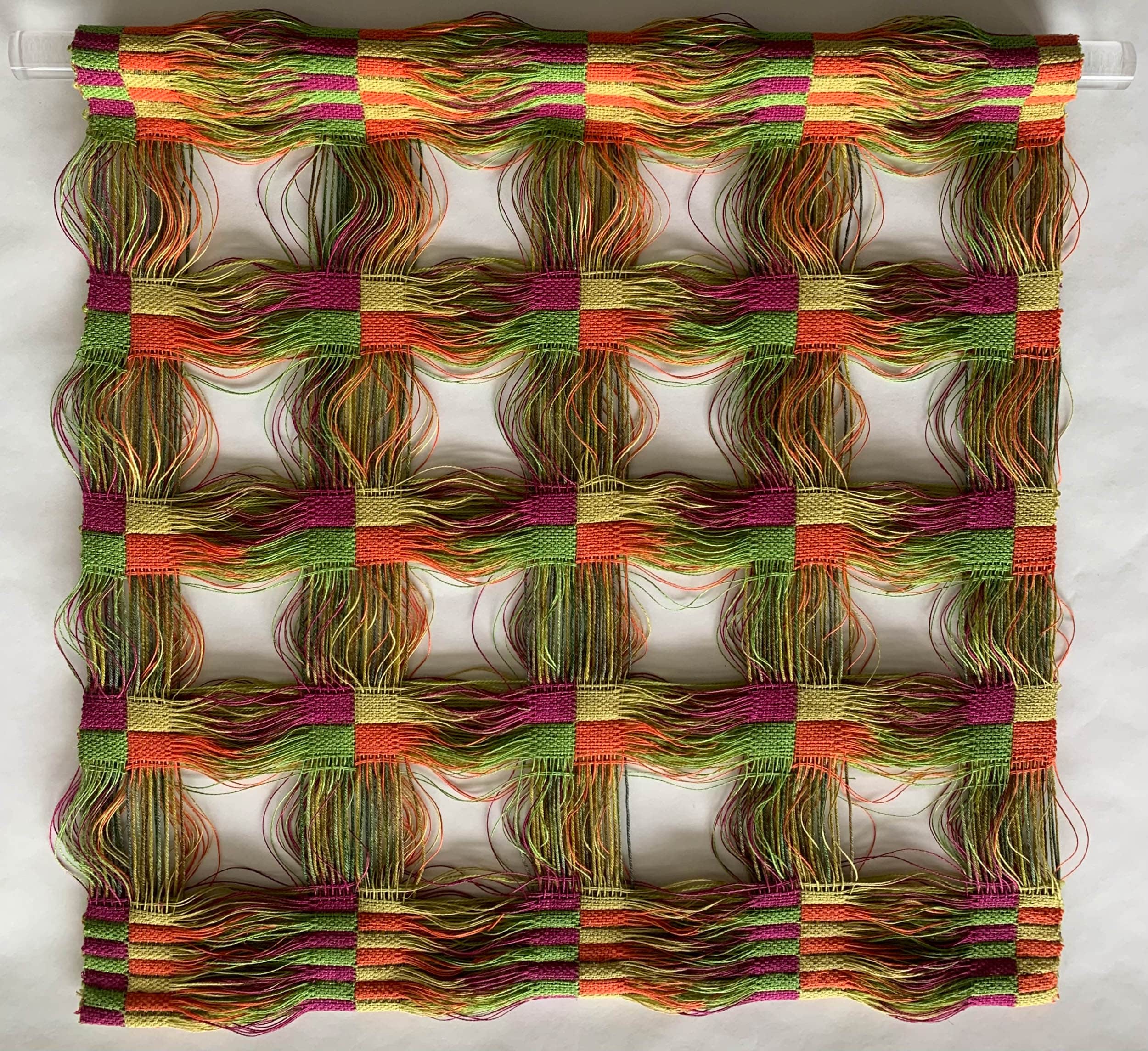 Last year my loom was in boxes, so I created swatches on a frame loom in plain weave with weeds for the filling. As an antidote to that simplicity, I conceived of a double layered fabric with four quadrants reversing from front to back in the middle of the design in both the warp and weft directions. I also wanted to use vibrant, intense colors. To create an even more dynamic design, I added a middle layer of wool that remains hidden from view but when taken off the loom pulls the stiff outer layers of linen into interesting waves and bulges. I set up enough warp to weave a section that was not cut up and serves to document this project.