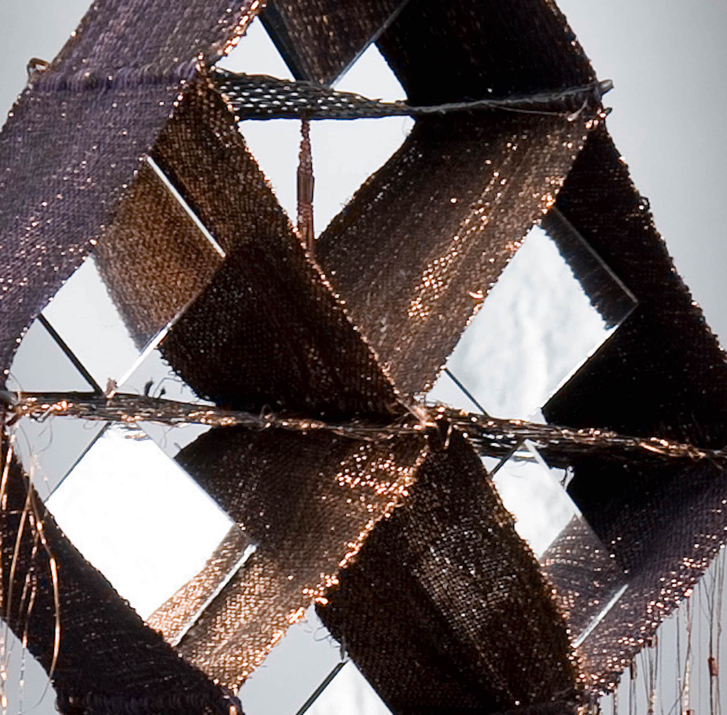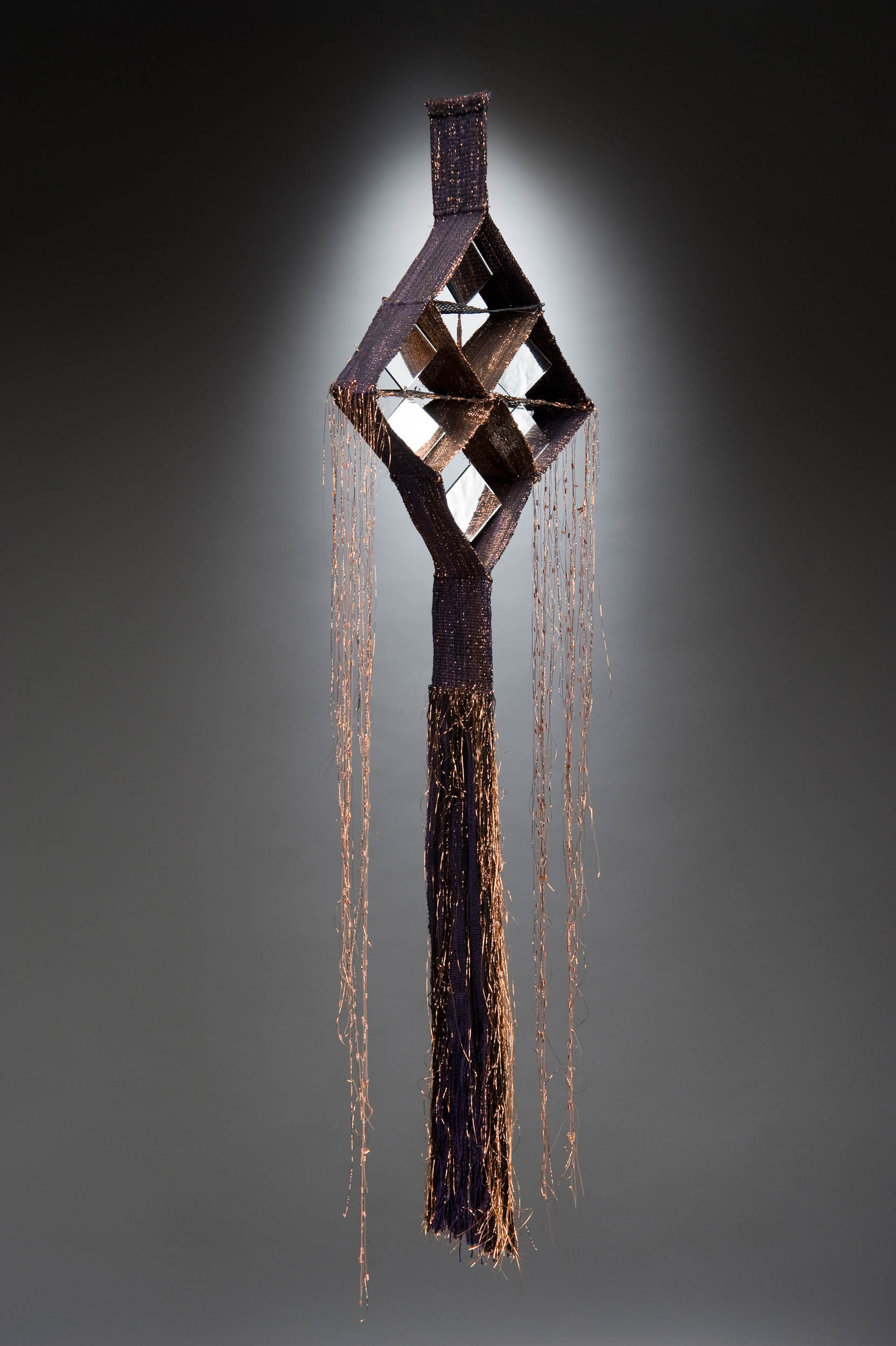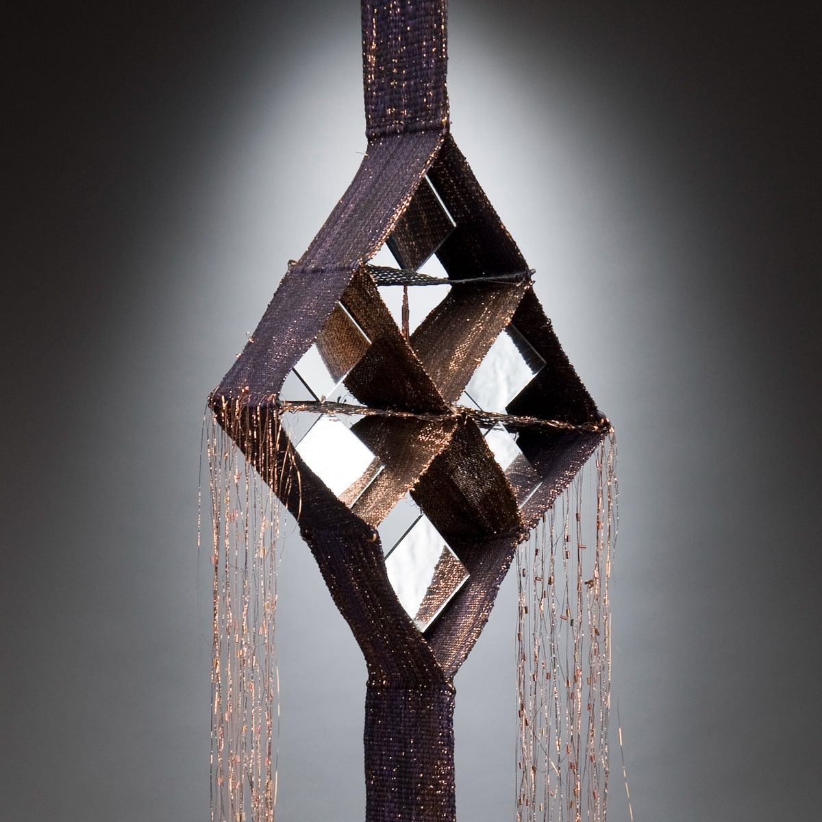 Materials: Cotton, metallic thread, beaded metallic thread, wire grid, double-sided mirrors, plastic rods