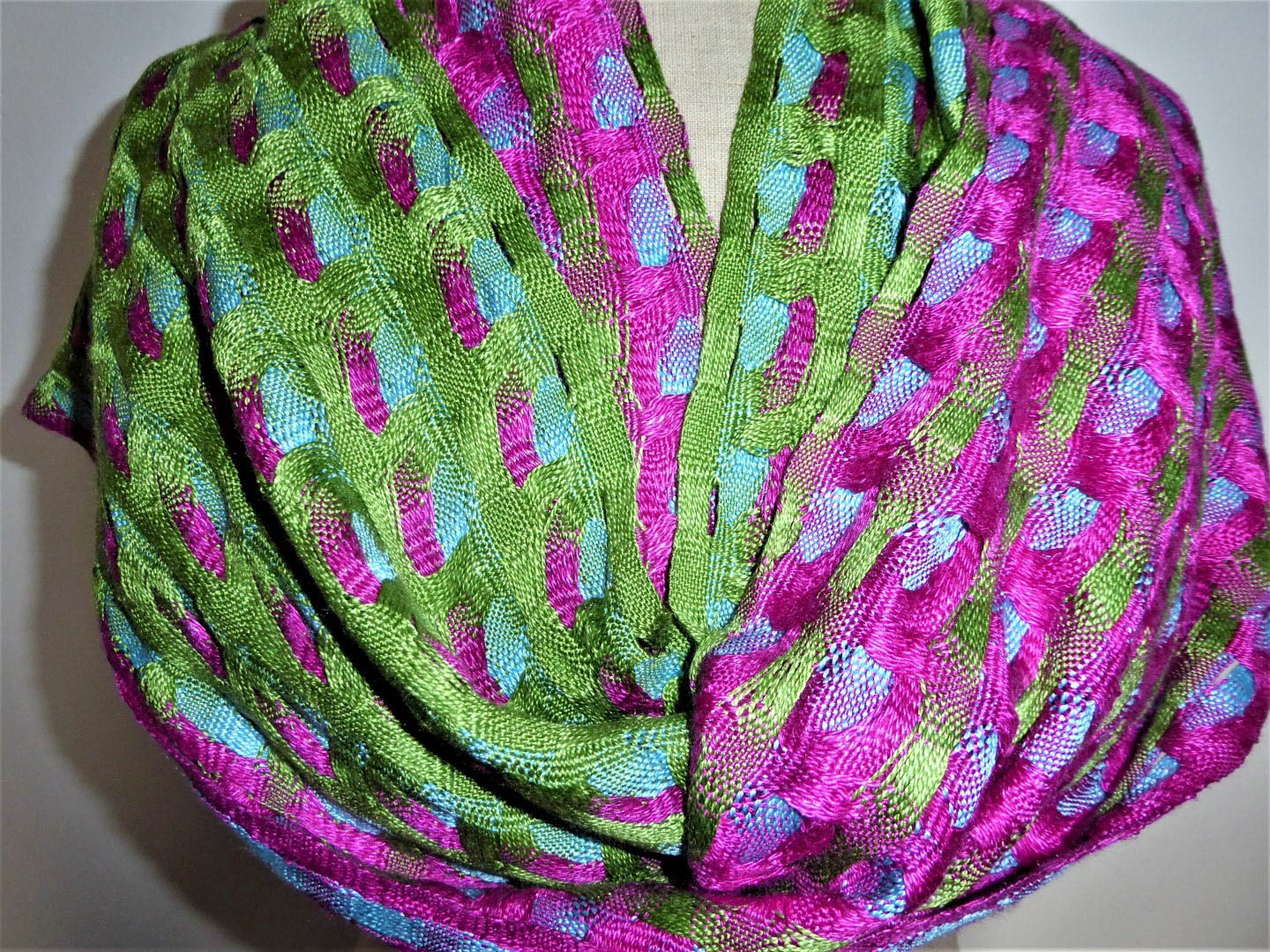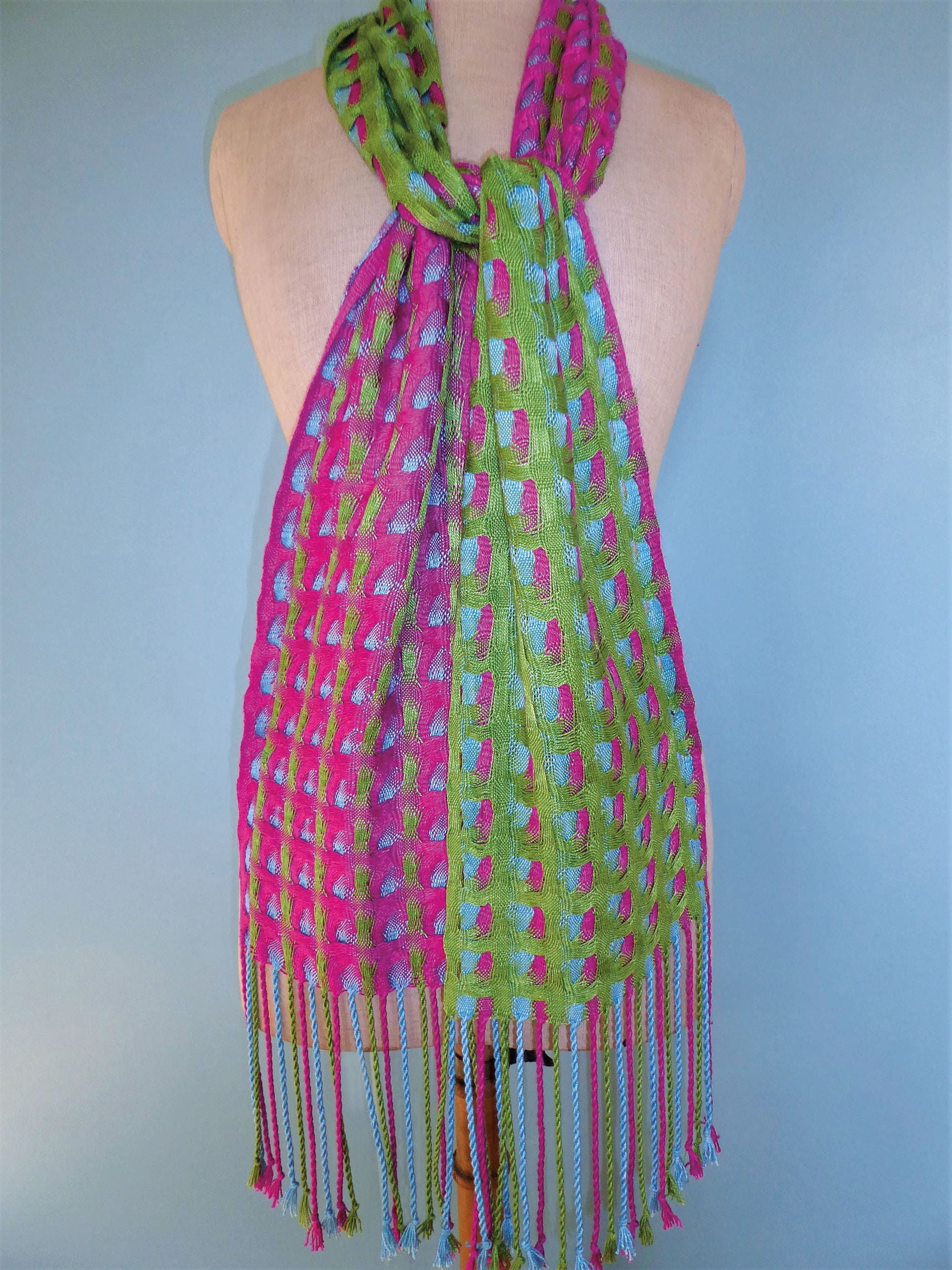 Materials: 16/2nm silk, hand-dyed in leaf green, aqua and magenta.