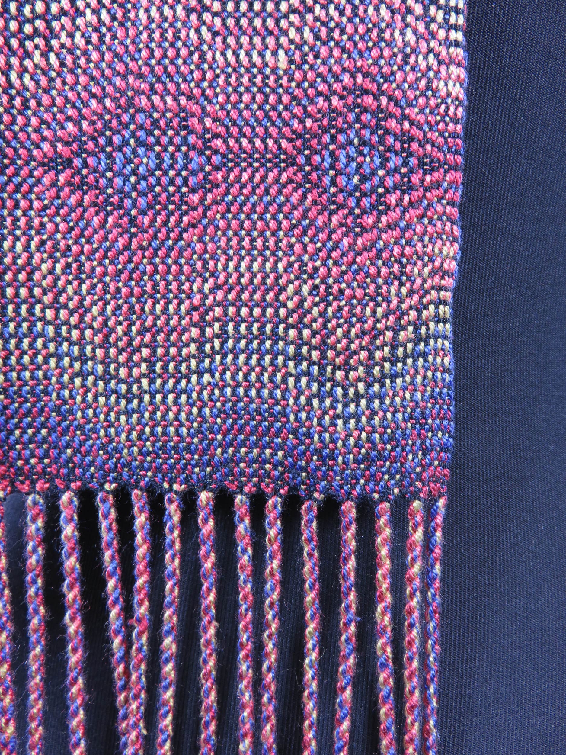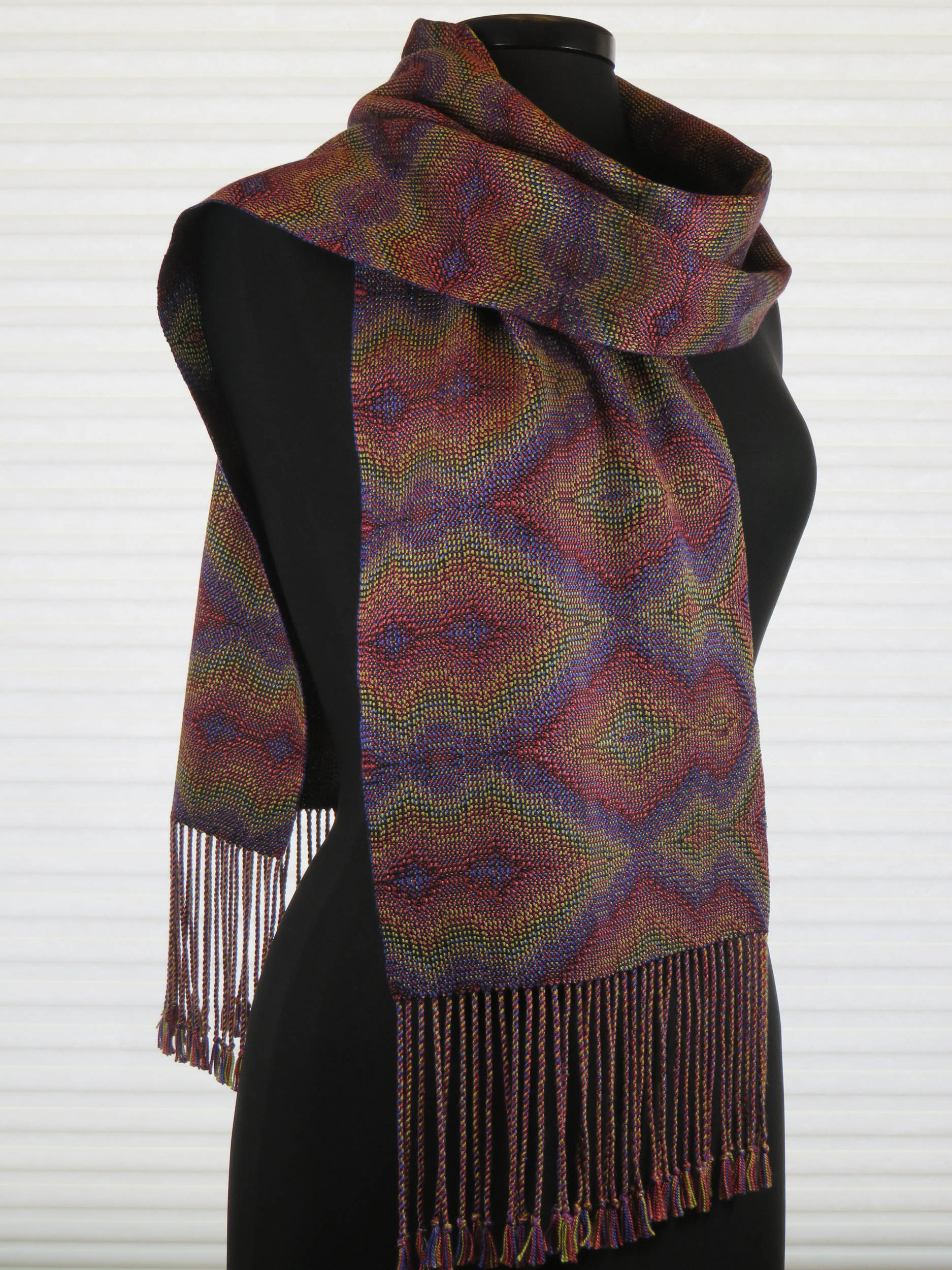 The woven shapes arise from a relatively simple design line that was inspired by the rises and falls in the topography of the mountains near me. The design line was manipulated and augmented, in order to achieve the final shapes. Colors were chosen to evoke springtime in these mountains.